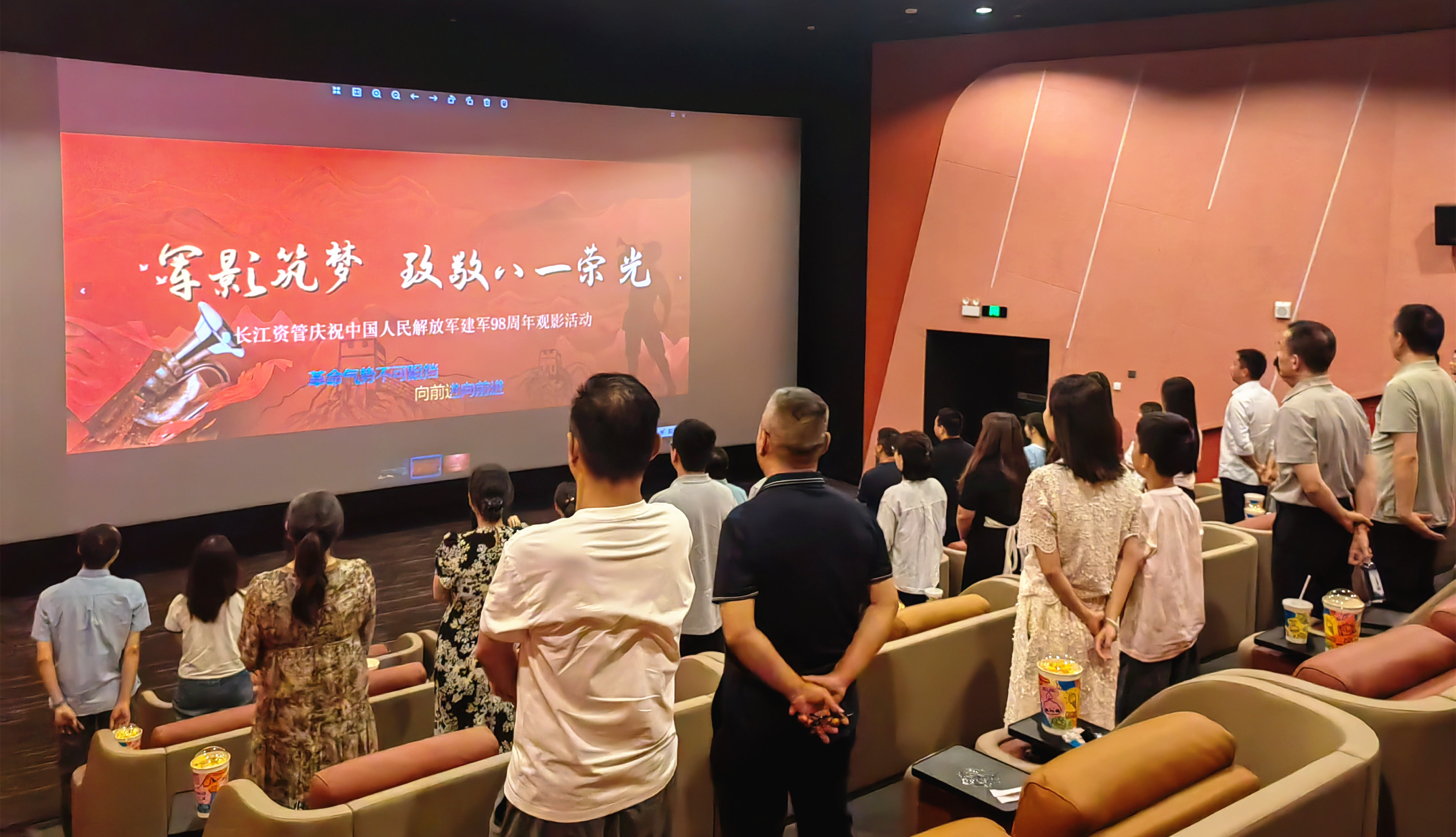 为庆祝中国人民解放军建军98周年,弘扬爱国拥军优良传统,8月1日,长江资管公司在汉街万达影院举办“军影筑梦 致敬八一荣光”主题观影活动。公司领导、退役军人及员工代表50余人参加。