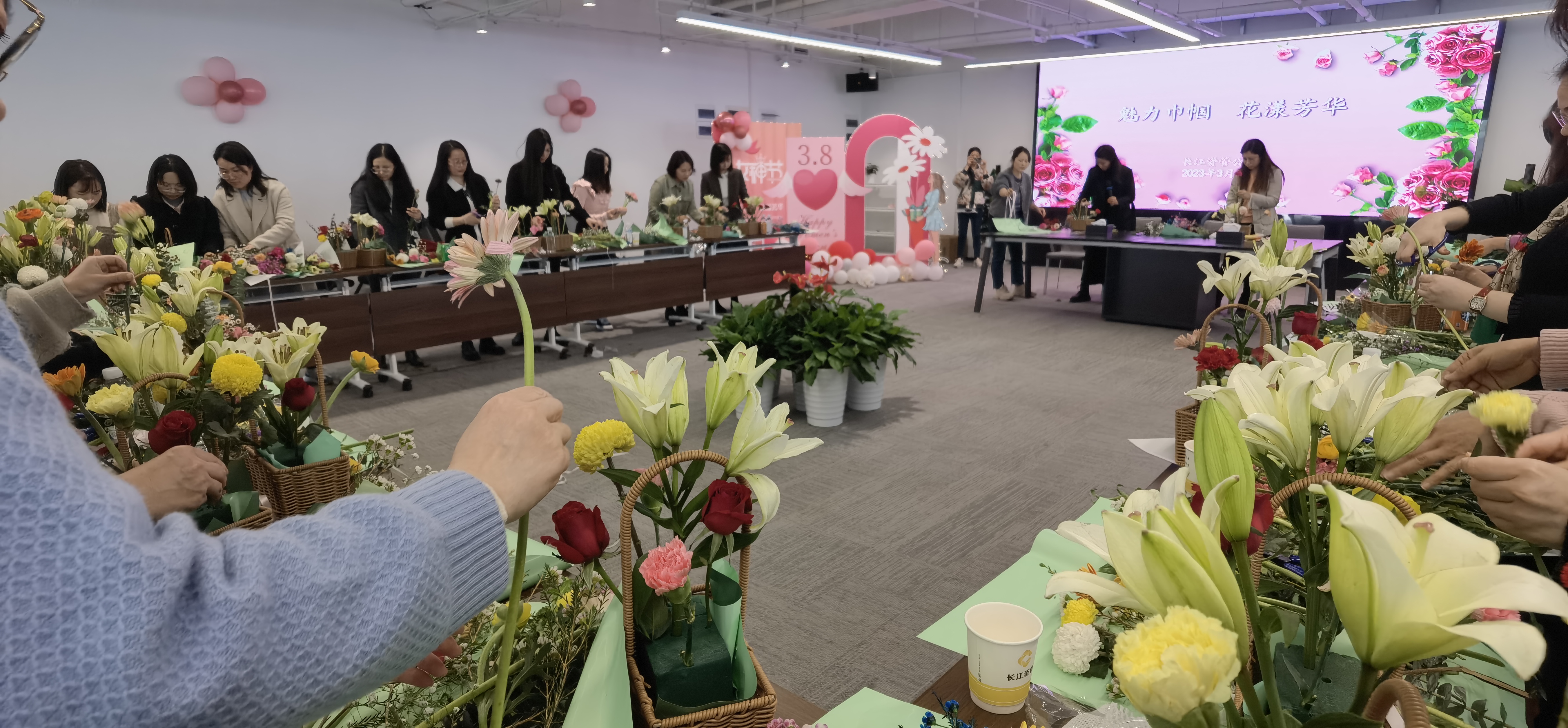 阳春三月,万象更新。在第113个“三八”国际劳动妇女节来临之际,为丰富女性职工文化生活,提高职工队伍凝聚力,3月3日下午,长江资管公司举办“魅力巾帼 花漾芳华”主题艺术插花活动,集团工会副主席彭静、部长付宇莅临活动现场,公司领导、本部全体女职工及所属企业女职工代表参加活动。